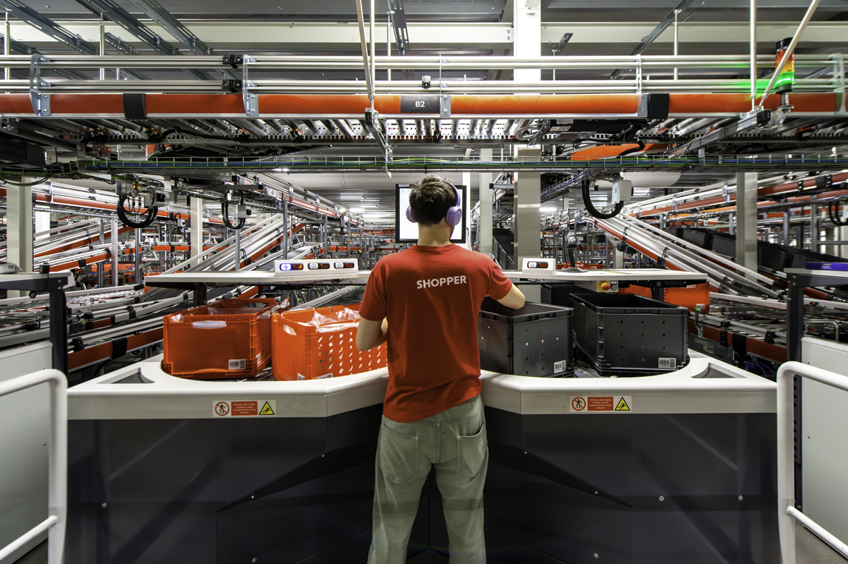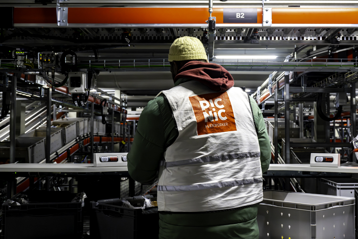 Above a portait of Picnic groceries delivery company CEO Michiel Muller, who says that advances in artificial intelligence are about to drive a "massive" boom in online grocery deliveries. Picnic has disrupted the Dutch supermarket landscape with its offer of free delivery in a time window of 20 minutes - made possible by squeezing efficiency out of huge amounts of data. Below, the company's distribution centre in Utrecht.